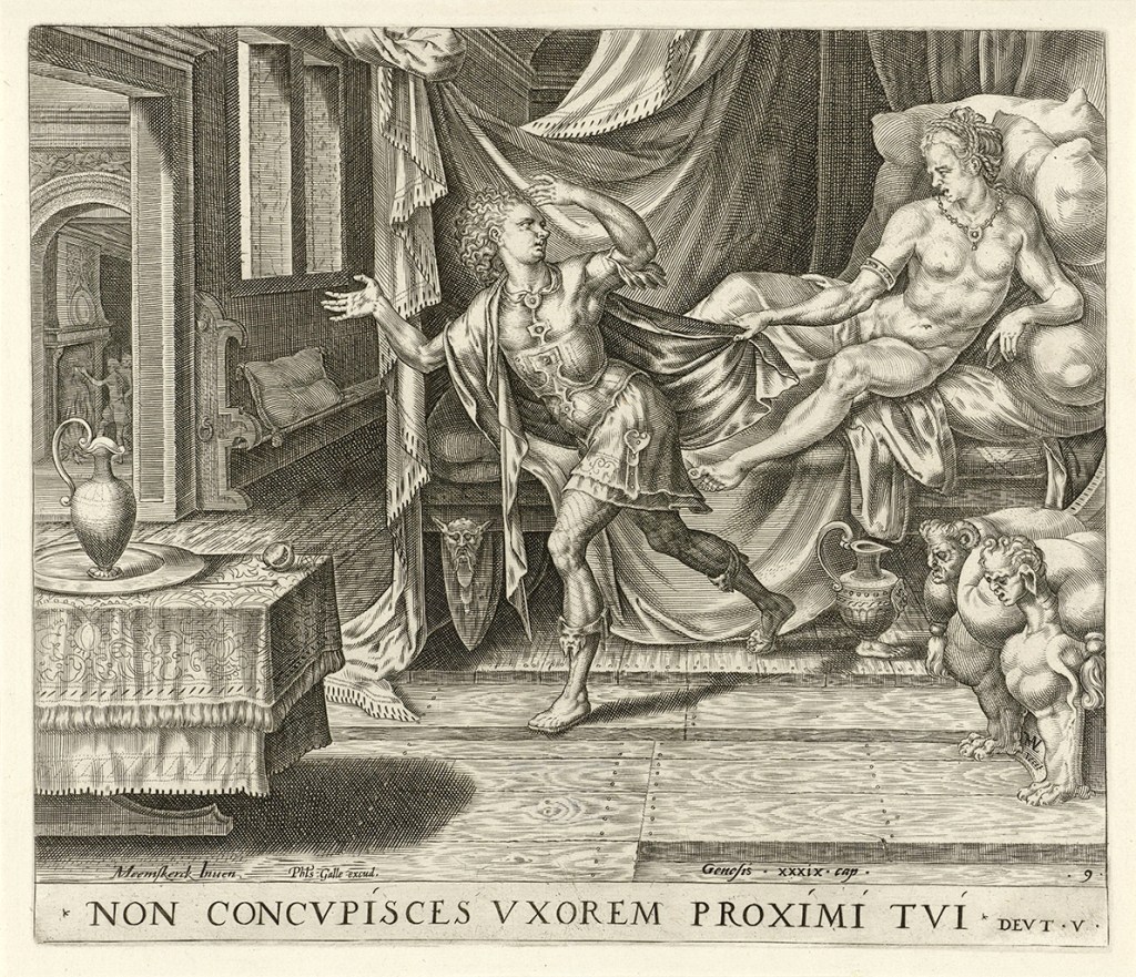 An engraving by Harmen Jansz Muller, after Maarten van Heemskerk, ca 1600. Man, is she ugly, this particular mrs Potifar. And the place is swamped with creepy monsters. In this case, I’m with Joseph.