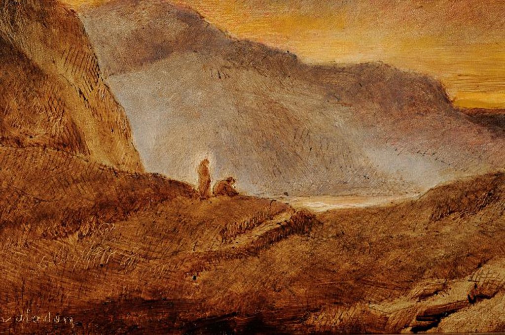Jules Valadon, second half 19th century. I came across this in the catalogue of a French art dealer. It is small, about 20×35 cm. Oil on a wooden panel. I can’t tell you much about the painter. He doesn’t seem to be related to Suzanne Valadon. I did read though, that he took a rather unpleasant stance in the Dreyfus affair – that horrible matter where French army officer Alfred Dreyfus was sentenced to lifelong imprisonment based on false accusations that turned out to be triggered by blatant anti-semitism. It pretty much split the country in two, and Jules here was a so called Anti-Dreyfusard. Not good, but this painting is breathtaking (there’s that dilemma again). I’m wondering – who is who? Is Jesus sitting and Mary Magdalen standing? Is that how he rejects her? Or is it the other way around: she sitting, bound to earth, and he upright, ready to ascend? With a bit of a halo?